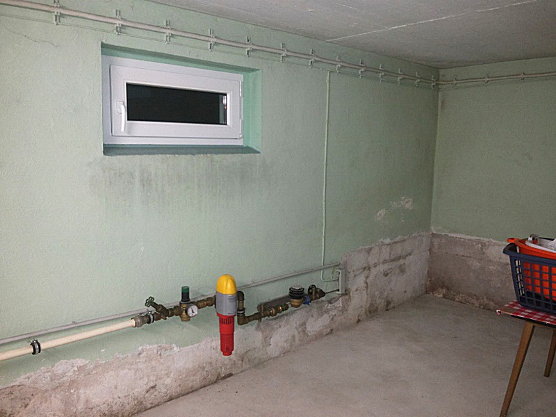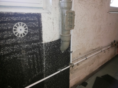 Kunststoff-Dispersionsfarbe wurde von den Wänden entfernt. Zur Vermeidung von Kondensfeuchte und Feuchteübergang am unteren Maueranschluss wurde das Aero-dry